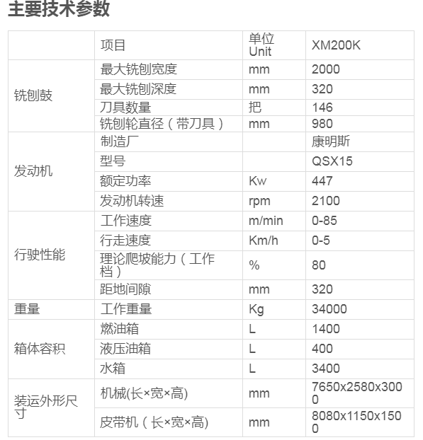 XM200K路面铣刨机是沥青混凝土路面养护施工机械,主要用于公路、城镇道路、机场、货场、停车场等沥青混凝土面层的开挖翻新。可以高效低清除路面痈包、油浪、网纹、车辙等;亦可开挖路面坑槽及沟槽;还可用于水泥路面的拉毛及面层错台的铣平。该设备工作效率高,施工工艺剑达,铣刨深度易于控制,操作方便灵活,机动性能好,铣刨的旧料能直接回收利用,可广泛地用于沥青路面的维修翻新养护施工之中。